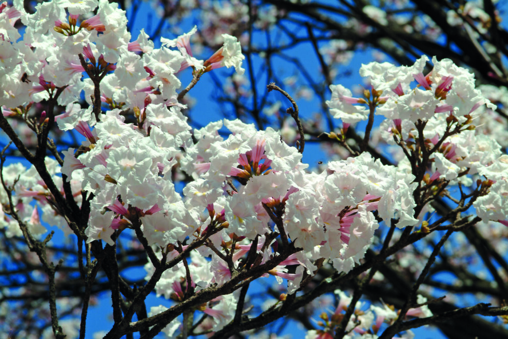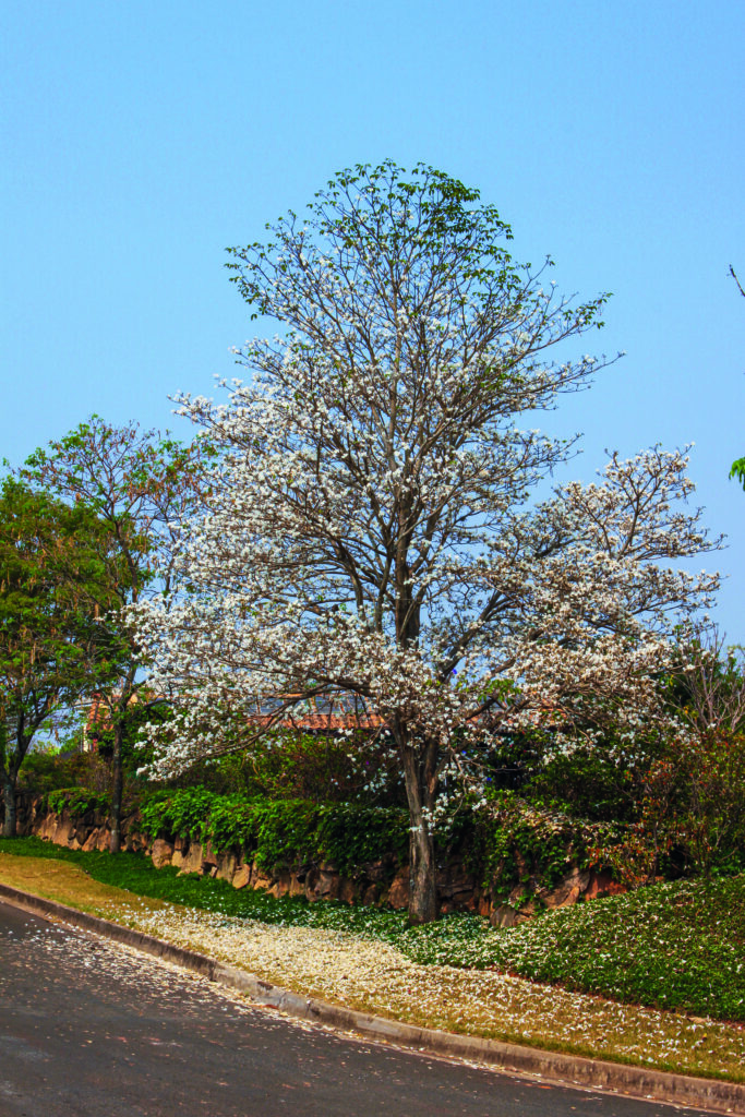 Este sim é nativo do Brasil, do Cerrado e do Pantanal, com uma floração pra lá de exuberante. Não é muito grande, variando de 7 a 16 metros quando adulto. A copa da Tabeuia roseoalba é piramidal e a floração acontece entre agosto e outubro. Perde todas as folhas, o que deixa o espetáculo ainda mais bonito. Se olhar de perto, você vai ver que as flores em forma de trompete são brancas ou levemente rosadas. Fica sensacional do paisagismo também pela sua forma elegante e, assim como outros ipês, dá uma ótima sombra nas épocas quentes e, por perder as folhas no inverno, deixa o ambiente mais aquecido e gostoso. É bem pouco exigente em relação ao solo e vai bem mesmo em solos pobres e pedregosos, o que faz do ipê-branco uma excelente árvore para áreas que precisam de recuperação ambiental. É também muito aconselhado para arborização urbana, em primeiro lugar por ser nativo e também por crescer cerca de 20 cm por ano e dispensar poda para deixar a área de pedestres sempre livre. O show é garantido, mas aproveite logo, porque dura cerca de uma semana.