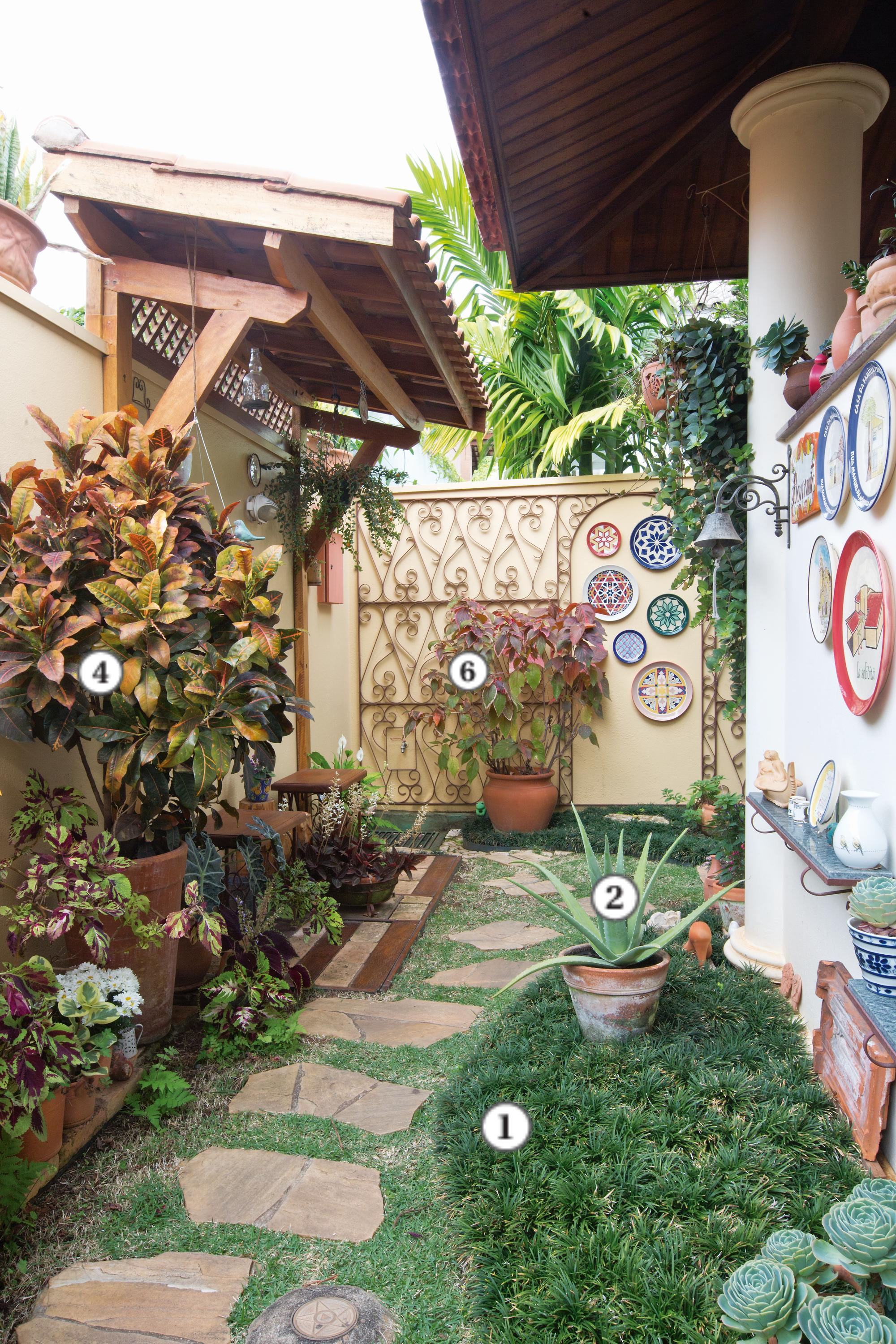 Em uma das margens do trajeto, o canteiro orgânico de grama-preta (Ophiopogon japonicus) (1) desfruta da companhia de vasos cerâmicos com suculentas como babosa (Aloe vera) (2) e rosa-de-pedra (Echeveria glauca) (3). Boa parte do charme do espaço se deve às prateleiras de granito fixadas na parede com a ajuda de suportes de ferro. Sobre elas, o artista plástico dispôs suvenires trazidos de uma viagem à Itália. Segundo Petrocino, o beiral da casa garante segurança das lembrancinhas mesmo nos dias de chuva e vento. Na outra lateral, as folhagens coloridas de espécies como o cróton (Codiaeum variegatum) (4) chamam a atenção: “A planta oferece diversidade de cores independentemente de floração e se adapta bem a situações de sol e sombra”, conta o artista plástico.