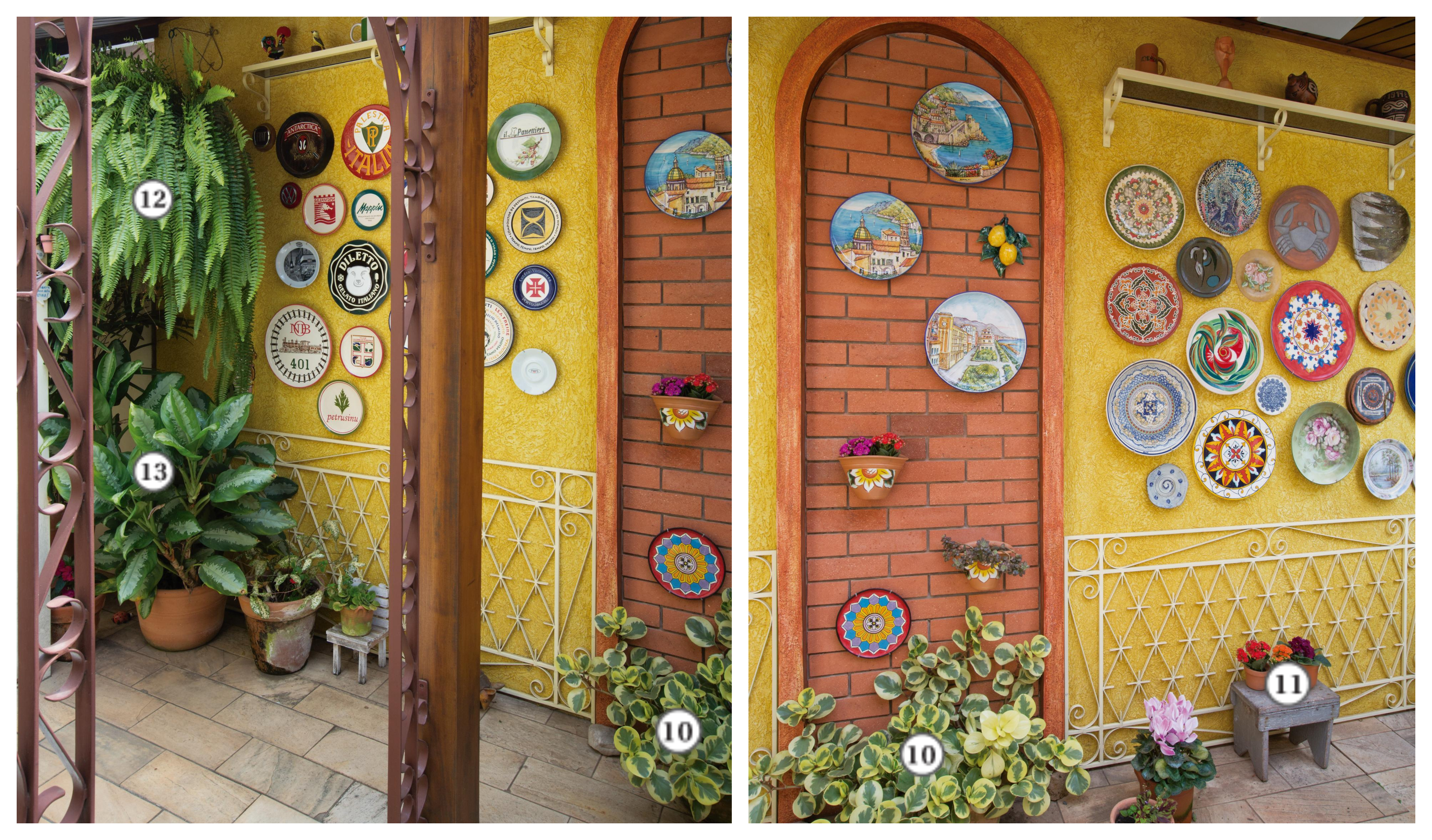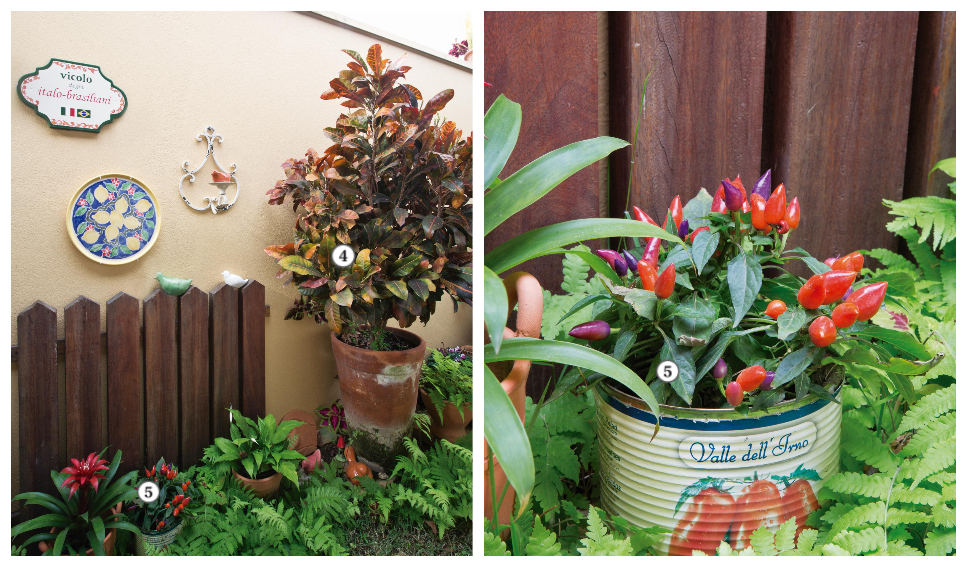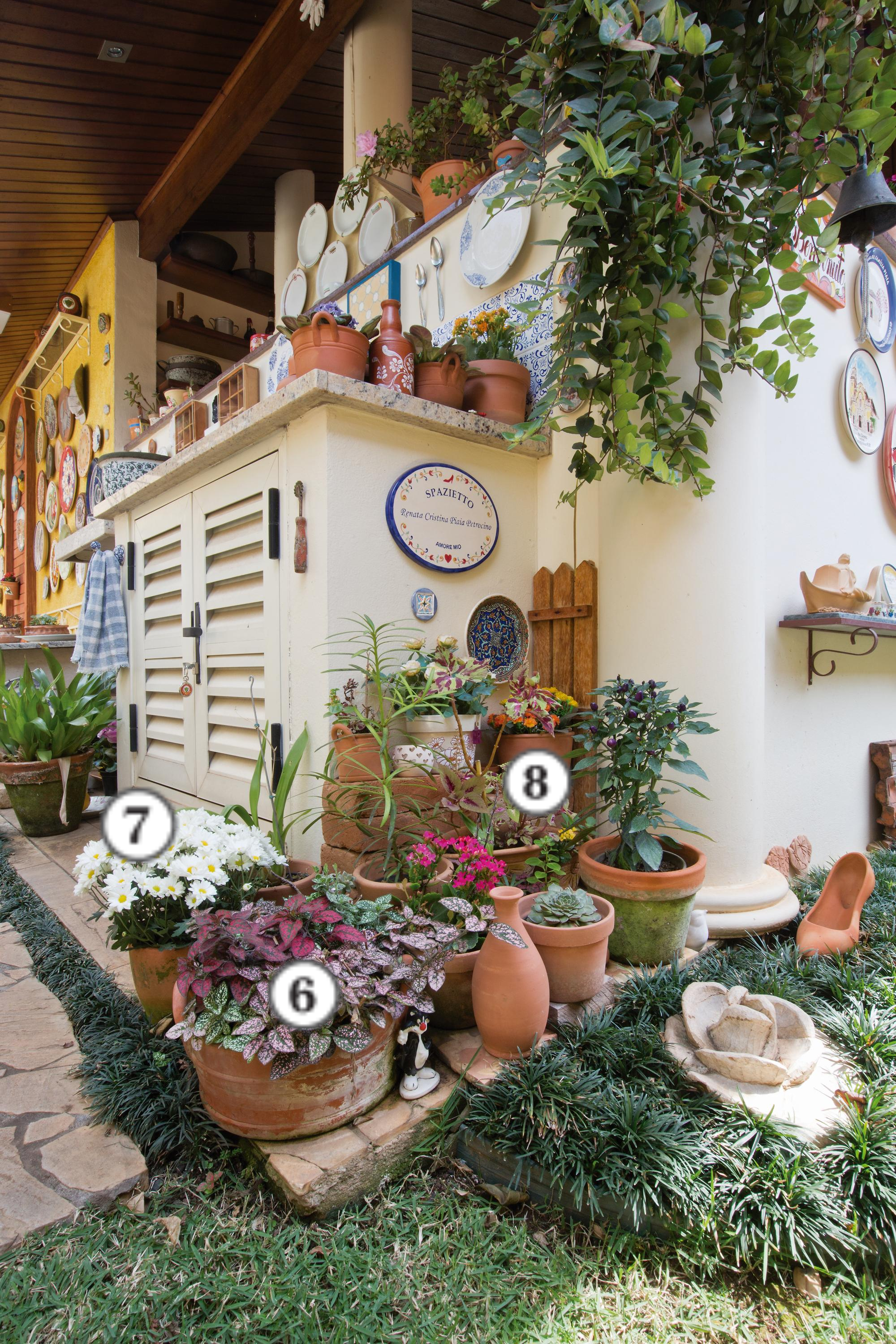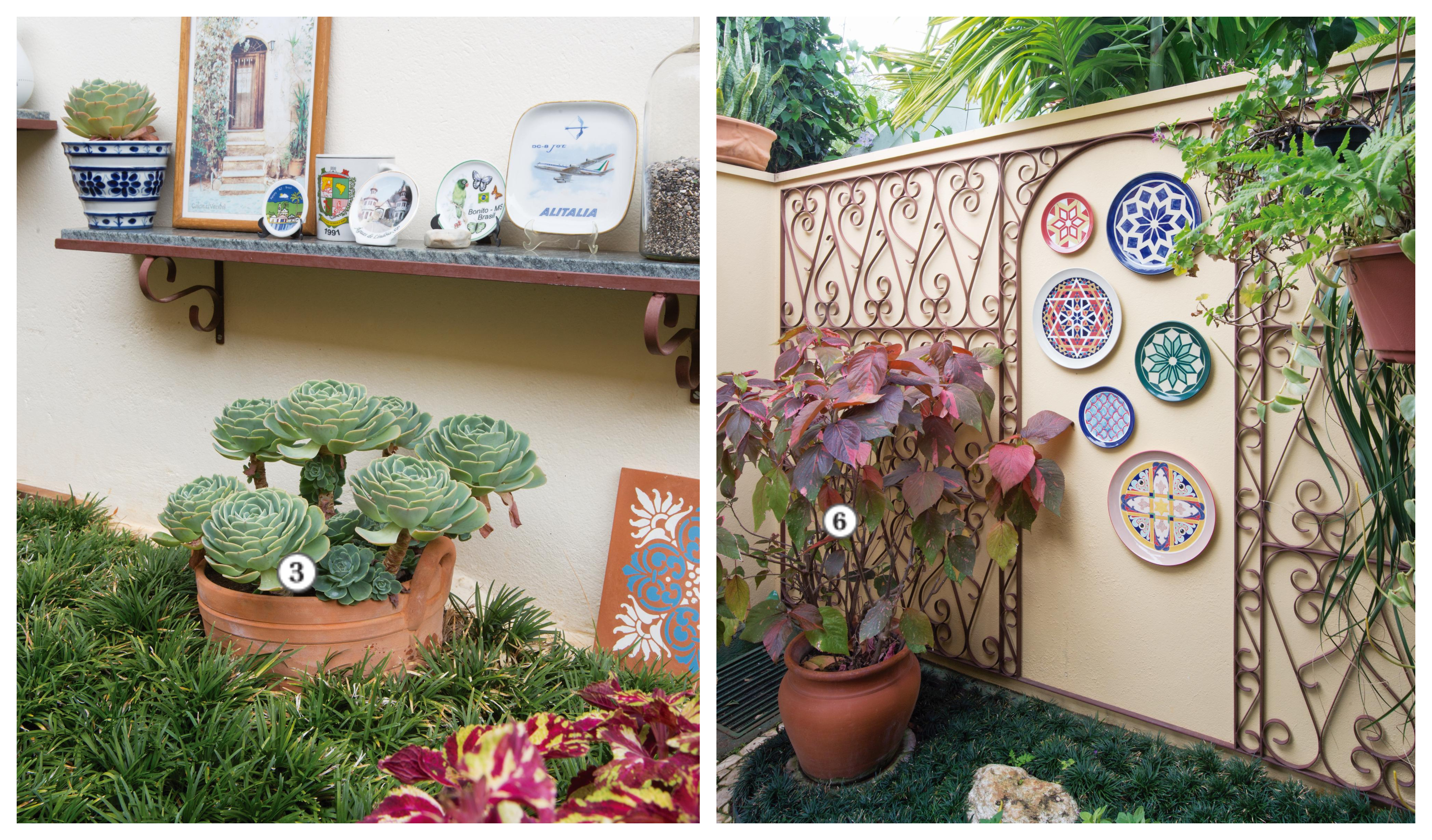 Perto dali, uma lata antiga de molho de tomate foi usada como vaso para a pimenteira (5). “Minhas avós também reciclavam esse tipo de vasilha para usar no jardim”, acrescenta Petrocino. No fim do corredor, o vaso com acálifa (Acalypha wilkesiana ‘Marginata’) (6) foi acomodado próximo a um conjunto de pratos de cerâmica pintados pelo artista. Eles exibem Desenhos de rosetas inspirados em detalhes da Catedral de Salerno, na Itália.