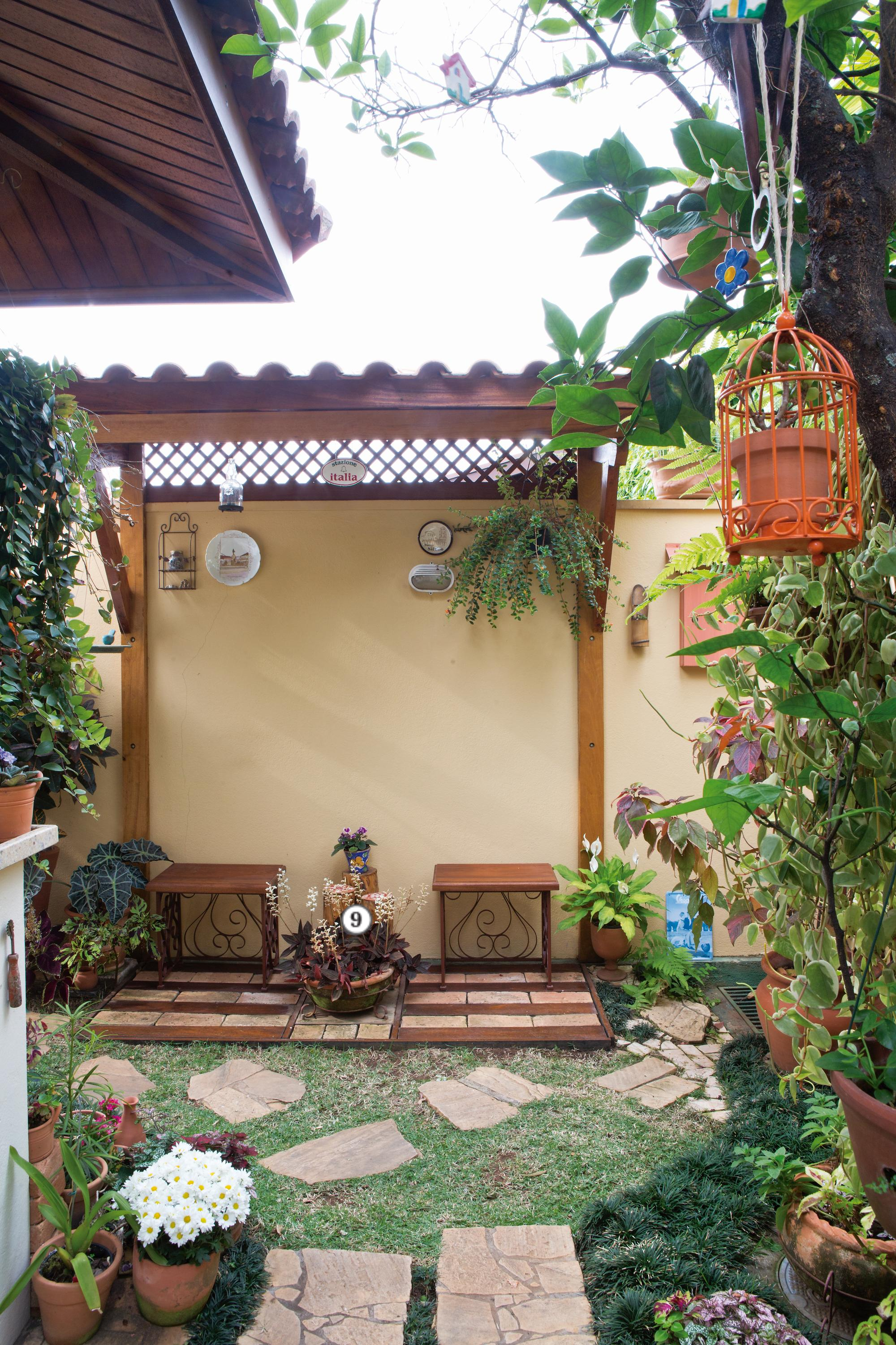 A última das atrações do jardim é uma área de convívio formada por um conjunto de mesa e cadeiras dispostas sob um caramanchão de madeira angelim. As laterais do espaço, que ocupa 4,4 m², foram ornamentadas por grades com volutas – desenhos espiralados que lembram caramujos. No chão, o revestimento de ladrilhos hidráulicos confere um toque retrô à composição.