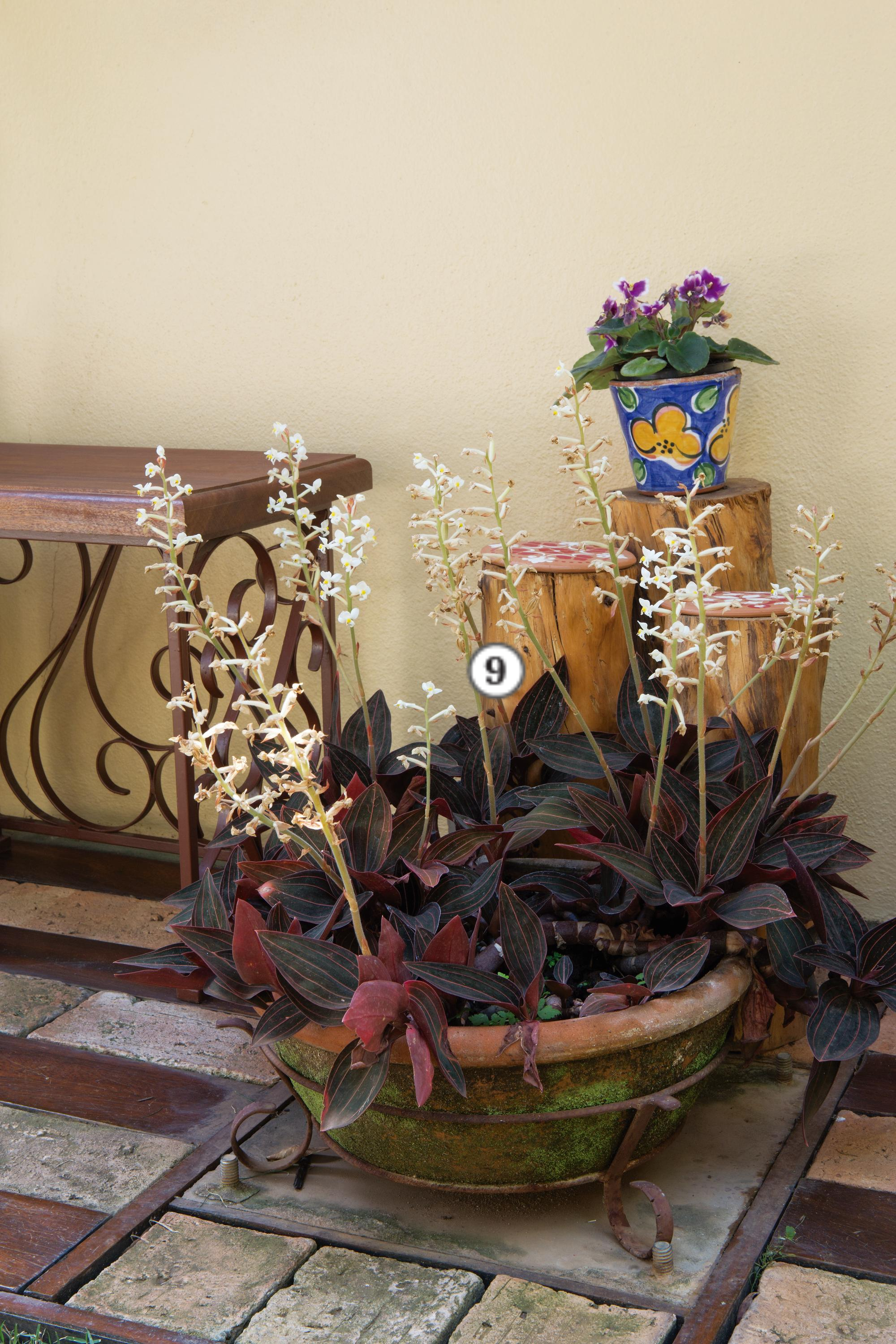 No ponto de encontro dos dois corredores, vasos aglomerados servem de suporte para folhagens coloridas e floríferas. Confete-anão (Hypoestes phyllostachya ‘Dwarf Confetti’) (6), crisântemo (Chrysanthemum hybrid) (7) e coléu (Plectranthus scutellarioides) (8) são algumas das plantas presentes na composição.