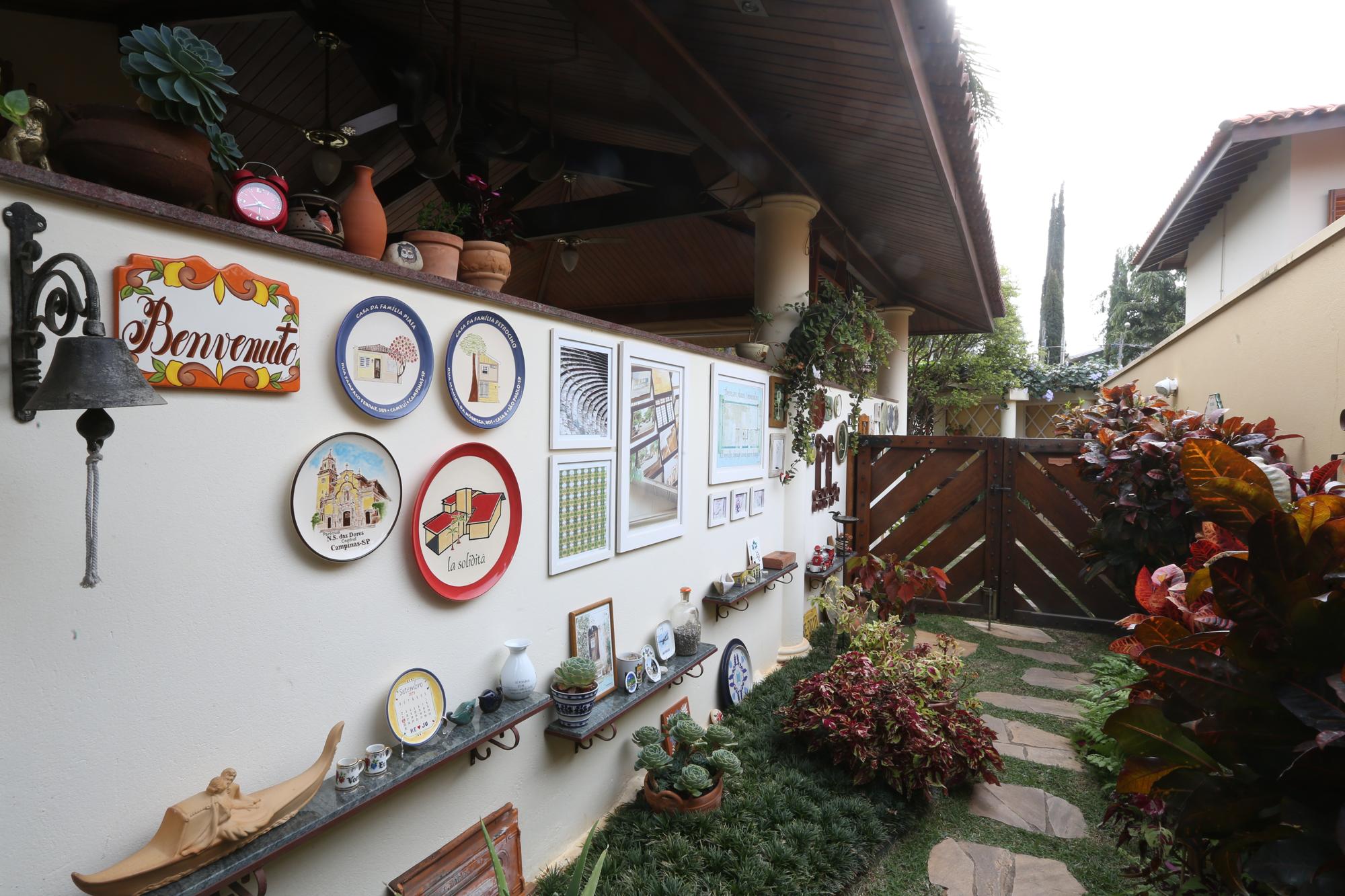 Do pergolado, é possível avistar um paredão amarelo enfeitado com pratos pintados por Petrocino. Tanto a cor da parede quanto o painel de tijolinhos à vista, em forma de pórtico, foram inspirados na arquitetura da cidade italiana de Calcata, que o artista conheceu em 2011.